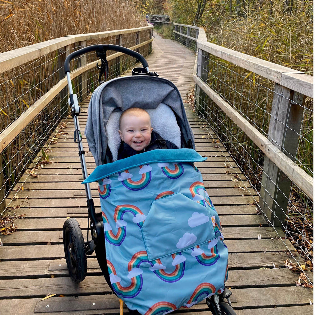 Excellent quality and so much better than traditional footmuff. Love the colour choices. The rainbow print really brightens up the pram and our little loves pointing at all the colours. So easy to use and store, perfect for travelling. Considering buying a second one!