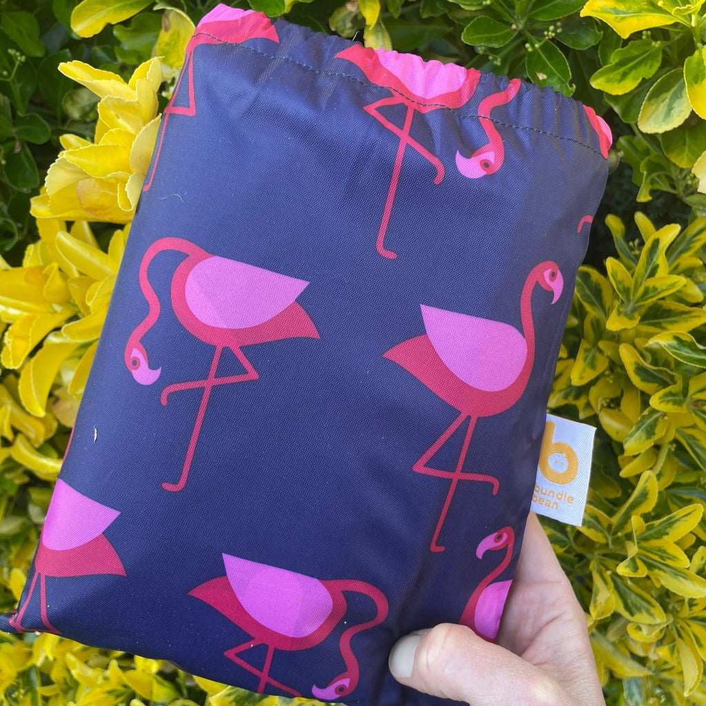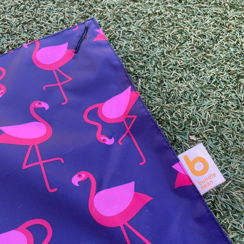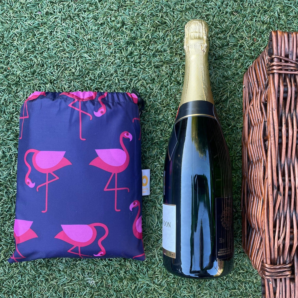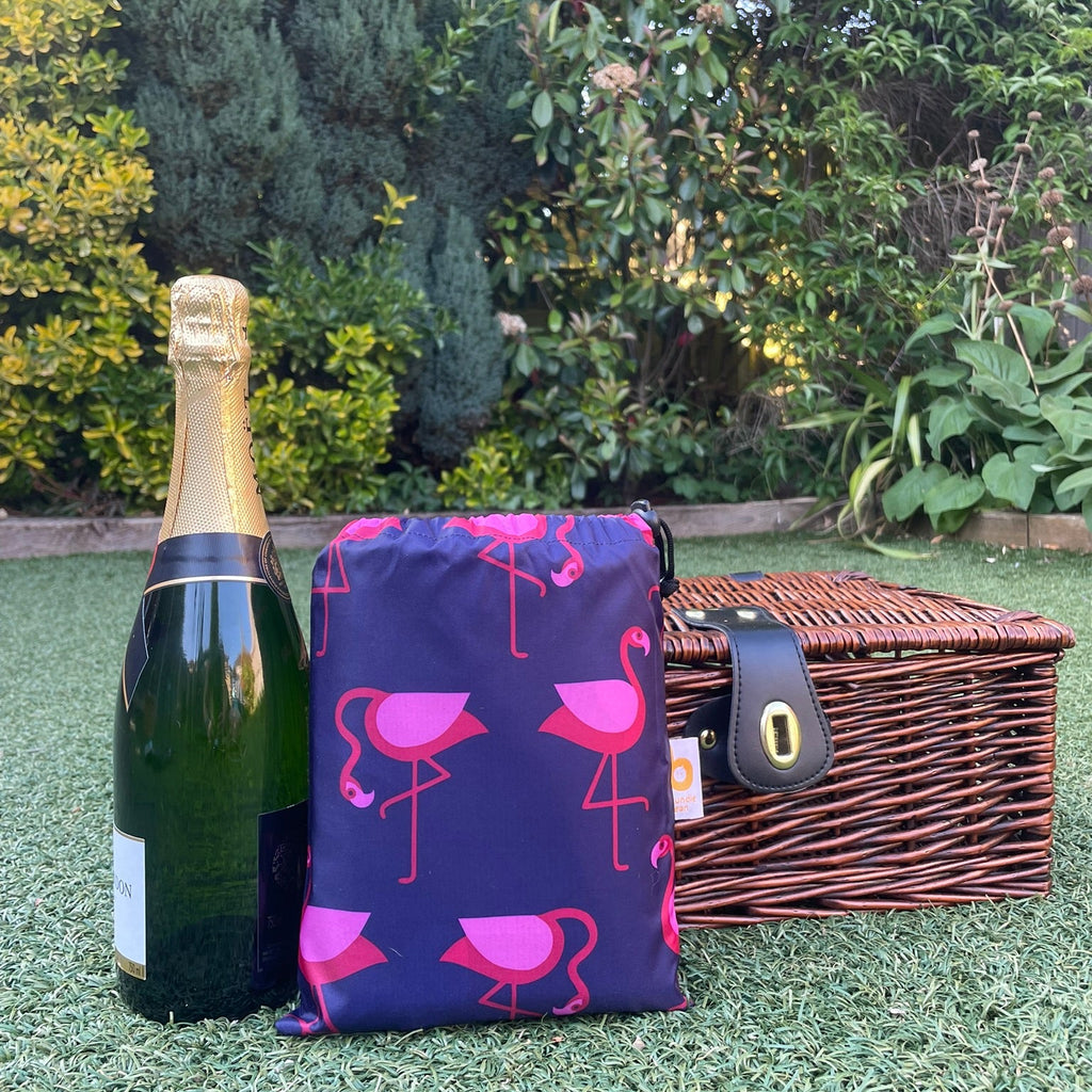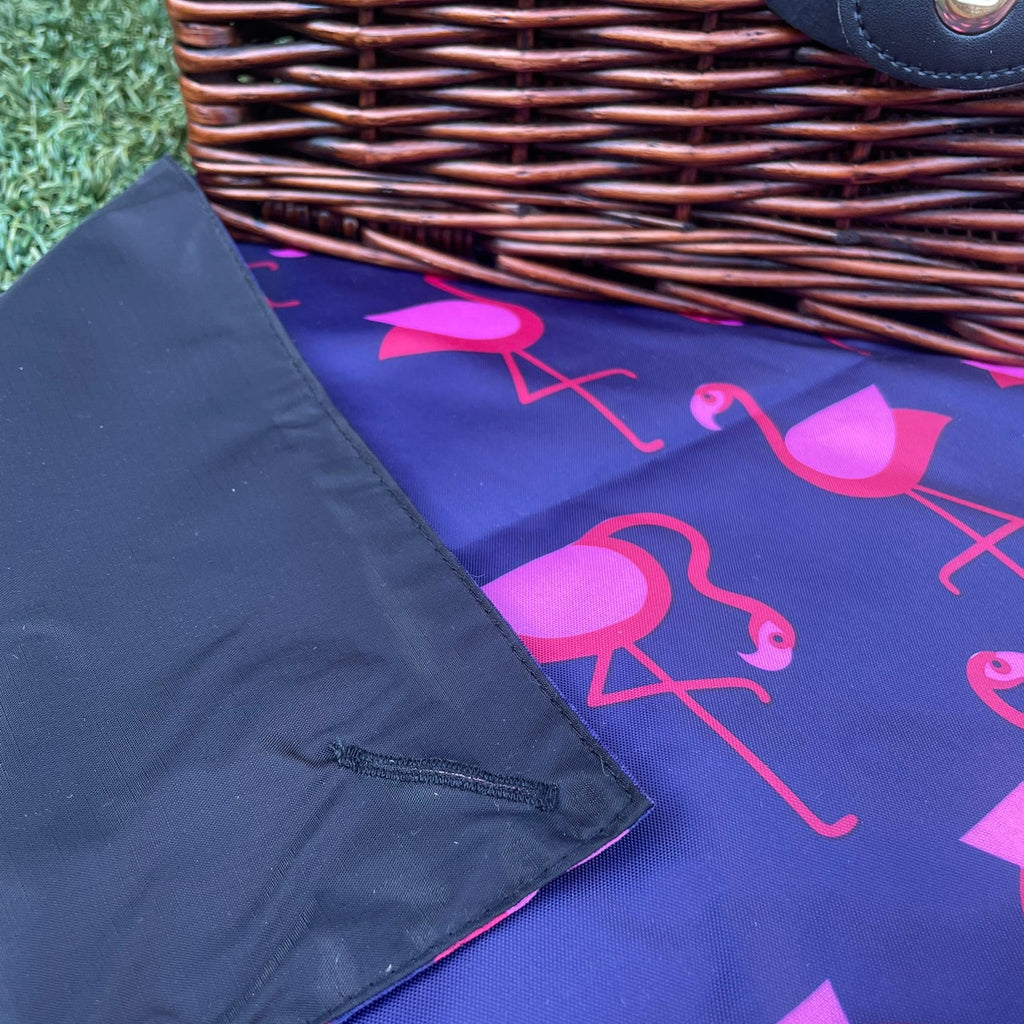 These beautiful large sized waterproof picnic blankets are double sided – our funky Navy Pink Flamingo design on one side, backed with tear-resistant Ripstop nylon. Super-lightweight and compact, these picnic blankets are perfect for days out, beach trips, picnics, as a play mat or for changing. At 140 x 140cm large these can accommodate 4 people. They feature 4 slits for pegs to hold it in place on windy days and a stuff bag for easy storage.