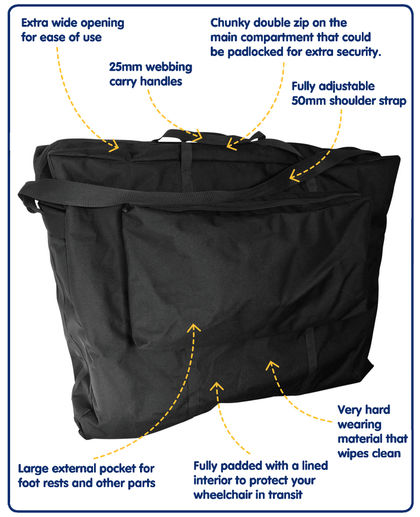 ENJOY YOUR HOLIDAY IN COMFORT AND SAFETY – 50mm wide fully adjustable shoulder strap and 25mm webbing carry handles for easy lifting and moving. This PU lining of this bag will also ensure your wheelchair is kept dry and clean when being stored or transported.