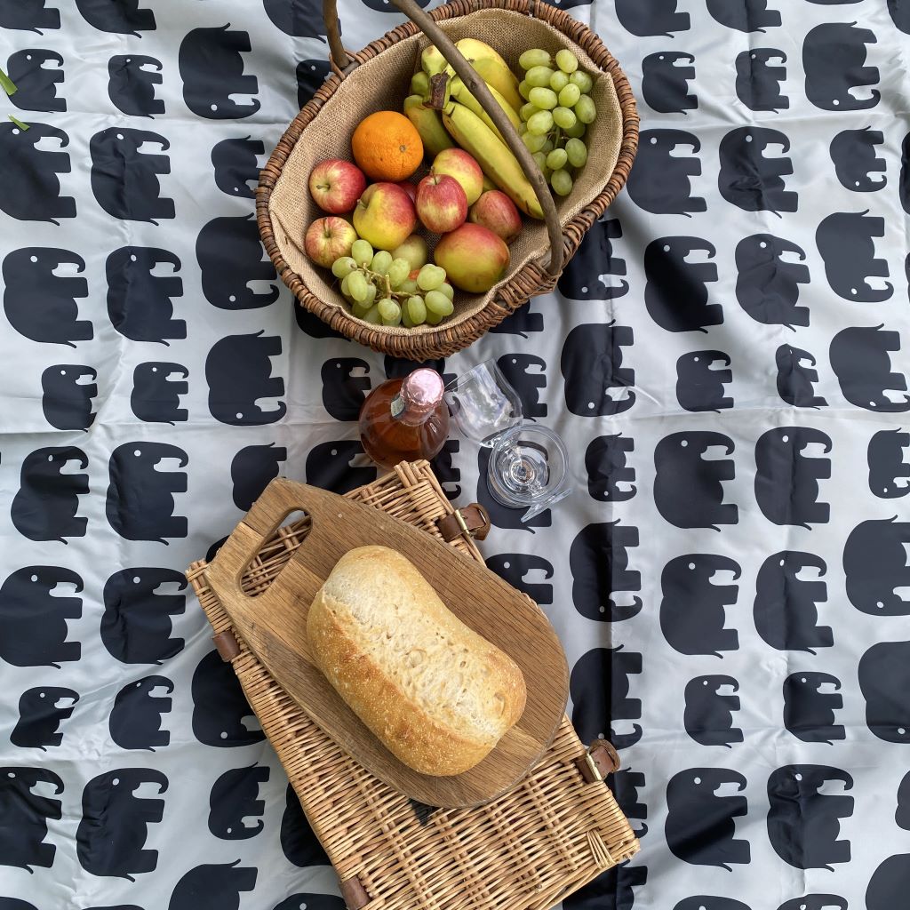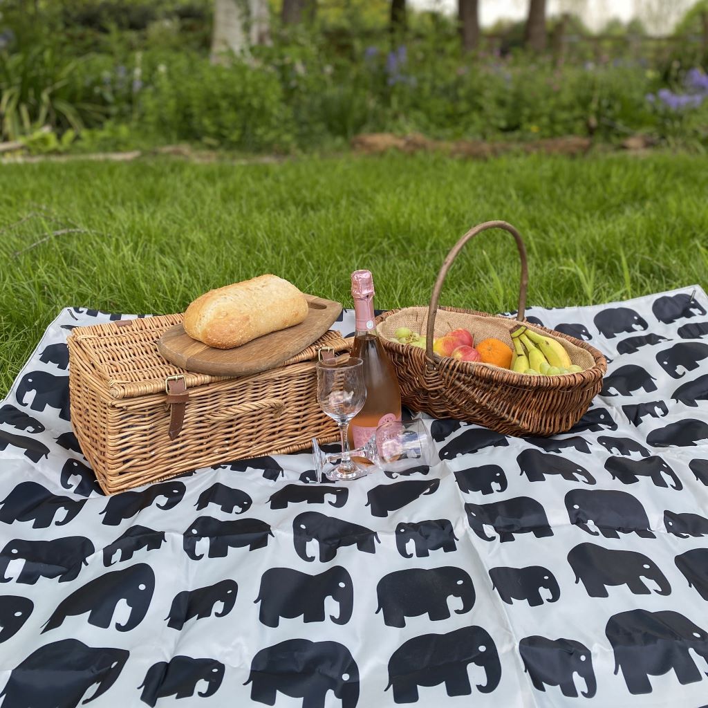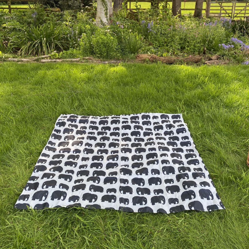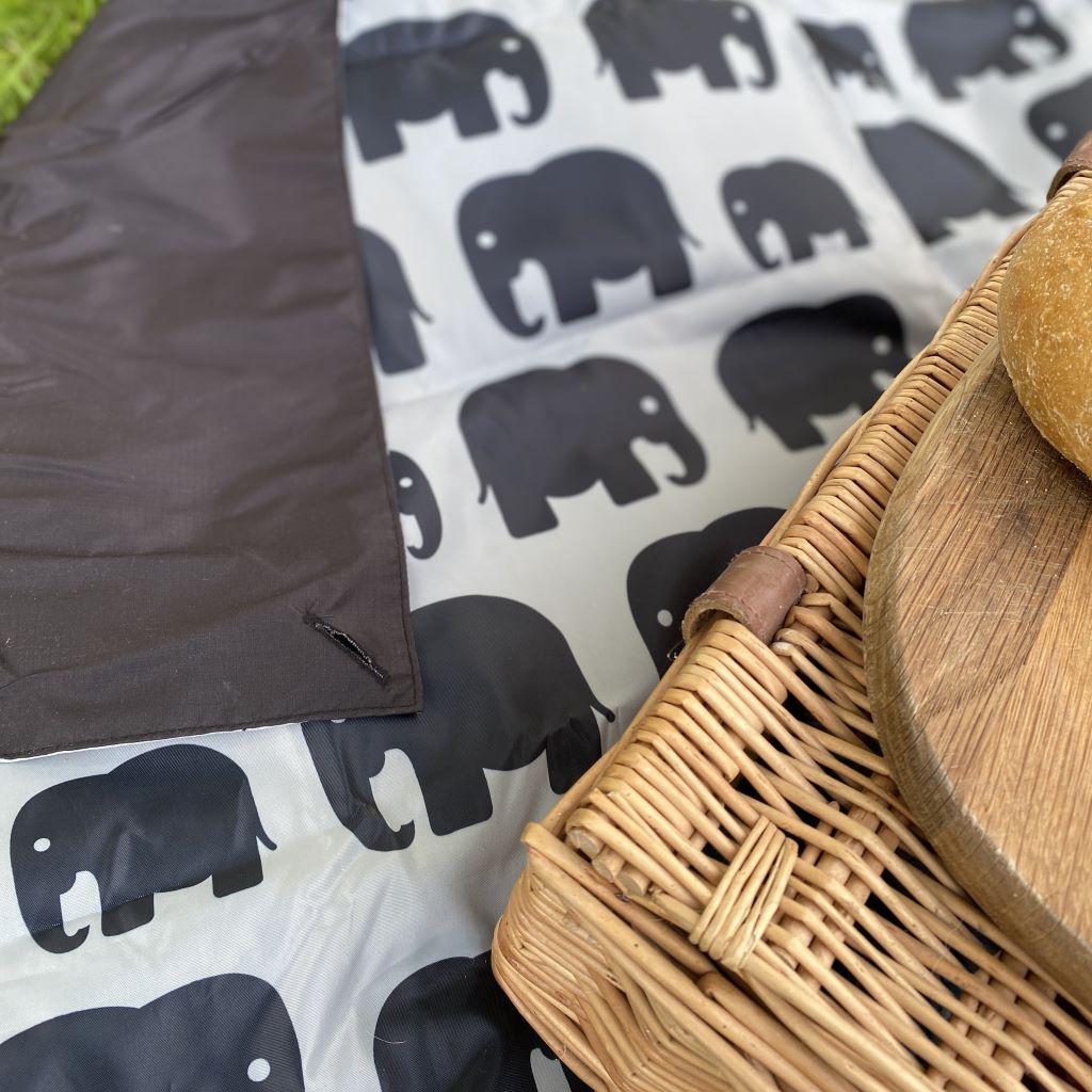 These beautiful large sized waterproof picnic blankets are double sided – our beautiful, much loved elephant design on one side, backed with tear resistant Rip-Stop nylon. Super lightweight and compact, these picnic blankets are perfect for days out, beach trips, picnics, as a play mat or for changing. At 140 x 140cm large these can accommodate 4 people. They feature 4 slits for pegs to hold it in place on windy days and a stuff bag for easy storage.